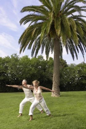 middle aged couple practicing yoga